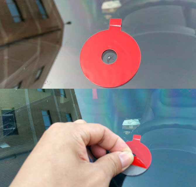 2.玻璃弄干凈后接下來把雙面膠貼到受傷的位置;然后再把上面紅色的膜撕掉